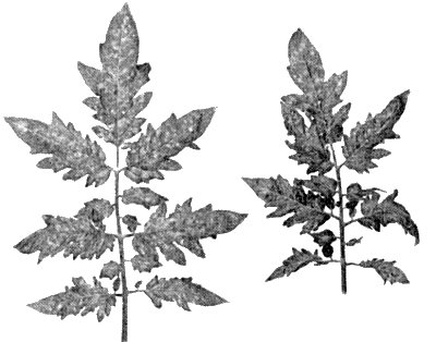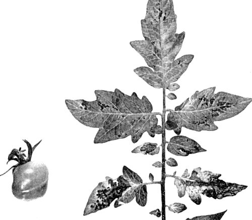 Causes a range of chlorotic, necrotic, stunting and enation symptoms in all parts of its many hosts. The bronzing symptoms in tomato leaves (Fig. 1, Fig. 6) and the one-sided growth (kromnek) of tobacco and tomato are characteristic. Leaf enations occur in Dahlia, flower deformations and colour breaking of the petals in Dahlia and Zinnia. The great variability in symptom expression is probably largely due to the complex of mixed strains.