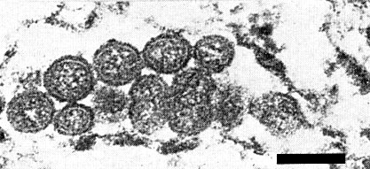 Particles approximately isometric, c. 70-90 nm in diameter, apparently bounded by a membrane (Fig. 4, Fig. 7). The structure of the material inside the membrane is uncertain. The outer layer of the membrane seems to consist of a nearly continuous layer of projections c. 5 nm thick, which stain more densely than the membrane itself. Purified particles sometimes show a tail-like extrusion (Fig. 7).