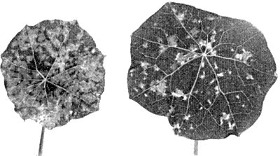 - Tropaeolum majus. Inoculated leaves symptomless; after 8-12 days a systemic mosaic pattern of yellow and dark green specks develops (Fig. 5), sometimes also with necrotic spots.