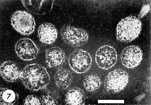 2. Black, Brakke & Vatter (1963). Extract 100 g systemically infected Nicotiana rustica leaves in 200 ml ice-cold 0.1 M potassium phosphate buffer pH 7, containing Na2SO3 (0.01 M). In this high ionic strength buffer, most of the infectivity is sedimented by low speed centrifugation (c. 1700 g for 30 min). Resuspend in 0.01 M Na2SO3 and concentrate by differential centrifugation. Sucrose density gradient centrifugation gives a visible zone with which most of the infectivity is associated. This method does not always give good results because it takes 8-10 hr and the virus is very unstable. Van Kammen, Henstra & Ie (1963) using nearly the same method as Black et al. confirm their experiences. The purified virus is not sufficiently free of cellular contaminants and the virus particles sometimes show a typical tail-like extrusion (Fig. 7).