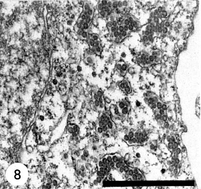 In the plant cell, the characteristic particles of tomato spotted wilt virus occur as clusters in cytoplasmic vacuoles, which are possibly cisternae of the endoplasmic reticulum (Fig. 8) (Ie, 1964; Milne & De Zoeten, 1967; Milne, 1970), and in the dilated lumen of the nuclear membrane (Kitajima, 1965). They have not so far been found in other cell organelles. The virus particles are found in the cells of roots, stems, leaves and petals. In the anthers of Tropaeolum majus they occur only in the endothecium tissue but never in the tapetum layer or in the pollen cells. In newly infected cells of young leaf tissue, typical dense masses occur in the cytoplasm between the ribosomes, sometimes in big complexes located near the nucleus. These dense masses are striated with a periodicity of about 5 nm (Ie, unpublished). The typical electron dense particles scattered singly between the ribosomes (Fig. 8), have no relationship at all with TSWV, but are normal constituents of the cells of some cultivars of Tropaeolum majus.