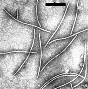 Helically constructed flexuous particles c. 550 nm long and 13 nm diameter (Fig. 8). The pitch of the helix, measured by X-ray diffraction, ranges from 3.3 to 3.6 nm depending on the water content of the specimen. True repeat is in five turns of the helix. Cross-banding is found by electron microscopy, but only in specimens stained with uranyl formate (Tollin et al., 1967; Tollin, Wilson & Young, 1968).