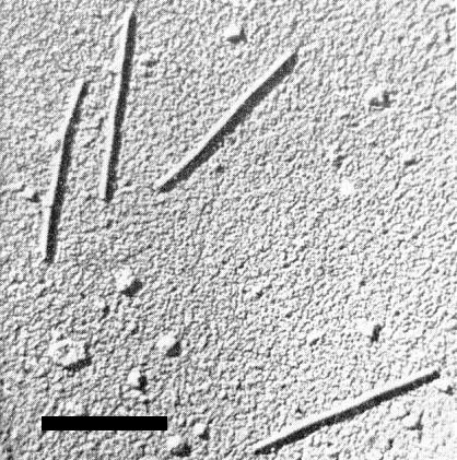 Particles are straight, sometimes curved, filaments with modal length of c. 650 x 12 nm (Fig. 5) (Wetter & Brandes, 1956; De Bokx, 1969).