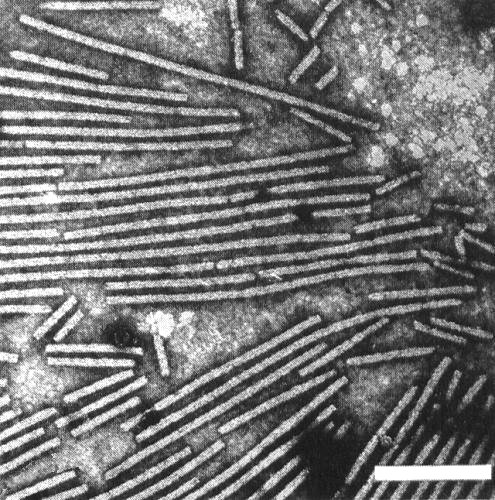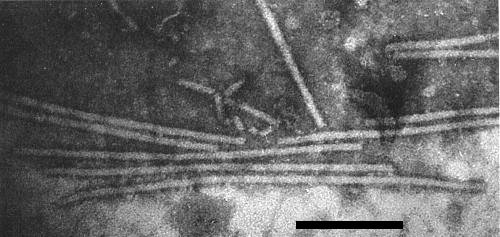 Particles are straight to slightly curved filaments c. 650 x 12 nm (Brandes et al., 1959) with a central channel (Fig. 2, Fig. 3). Particles are helically constructed with a basic helix of pitch 3.3 nm and about 12 subunits per turn (Varma et al., 1968).
