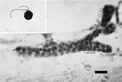 Polymyxa graminis sporangium with exit tube reaching host cell wall. Bar represents 12 µm. Inset is a biflagellate zoospore of P. graminis at 2.5 x the magnification of the sporangium. (From Rao, 1968.)