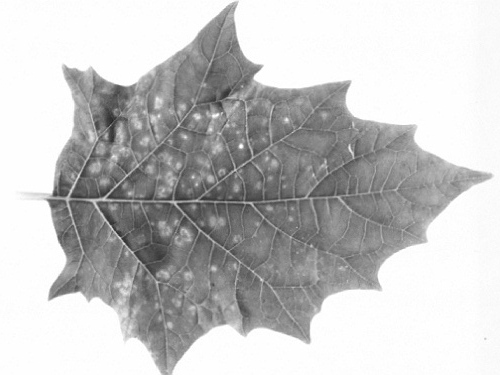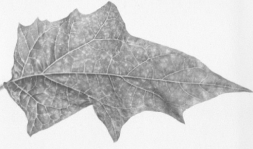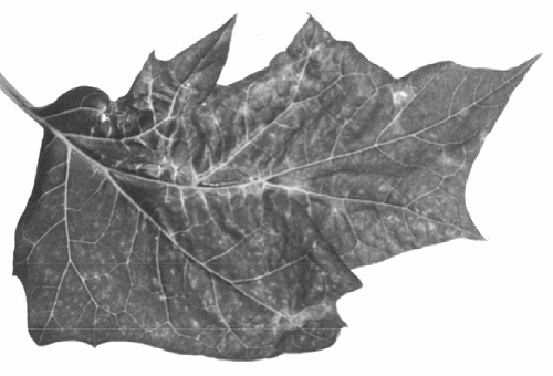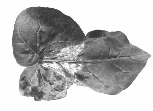 Chlorotic to necrotic local lesions may appear in about 10 days; systemic mosaic appears in about 18 days (Fig. 1) and often is accompanied by necrosis of fine veins. Occasionally, leaf distortion (Fig. 2) and necrotic rings (Fig. 3) are seen. - Nicotiana glutinosa. Symptom expression erratic. Sometimes local lesions form, occasionally systemic infection results in mosaic symptoms (Fig. 4).
