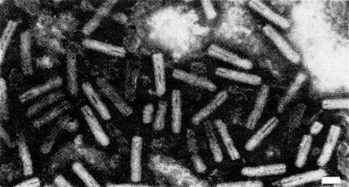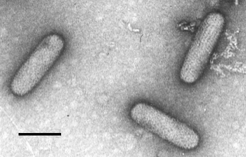 Particles are bacilliform in uranyl acetate (Fig. 5) and measure 275 x 75 nm. In potassium phosphotungstate occasional bacilliform particles (Fig. 6) are seen but most particles are bullet-shaped and measure 266 x 66 nm (Fig. 7). The bullet-like shape is regarded as a staining artifact. The particles have an outer envelope 13.5 nm thick with hexagonally arranged subunits; uniformly arranged spikes (8.5 nm long) project beyond the envelope. Within the envelope is a helically coiled filament with a 4.5 nm periodicity; this is thought to be the nucleoprotein. Preparations may contain bag-like rosette structures (Fig. 7) which are thought to be virus membranes remaining after disintegration of the internal structures (Lin & Campbell, 1972).