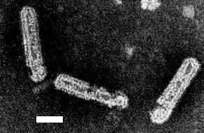 Virus particles from purified preparation in uranyl acetate, showing pattern of outer envelope. Bar represents 100 nm.
