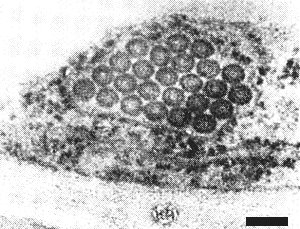 No inclusion bodies are found. Virus particles are enclosed in membrane-bounded sacs in the cytoplasm of parenchyma cells (Fig. 8). These sacs are formed from endoplasmic reticulum; the final stage of virus assembly occurs when the incomplete particles pass through the membrane into the sac lumen (Hills & Campbell, 1968). In virus-containing cells, the mitochondria were swollen and the cristae were scarce (Hills & Campbell, 1968).