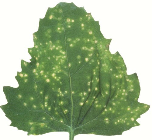 . Discrete necrotic local lesions 1-2 mm diameter in 6 days, later developing chlorotic margins (Fig. 1). Subsequently the inoculated leaves become chlorotic and absciss. No systemic infection. - C. quinoa. Irregular papery necrotic local lesions 1-2 mm diameter