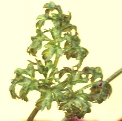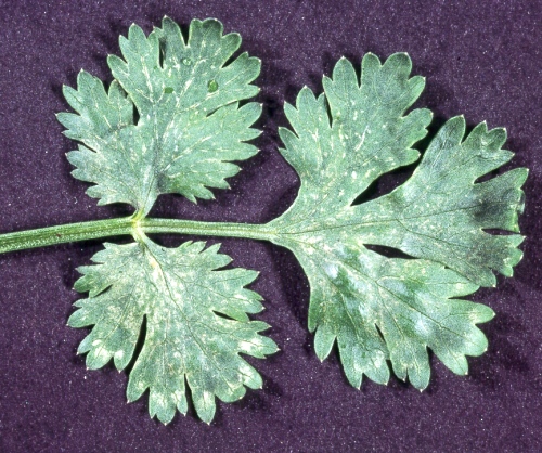 - Coriandrum sativum (coriander). Severe systemic veinal necrosis and distortion of youngest leaves in 8-14 days (Fig. 3). Plants may die after 2-3 weeks.