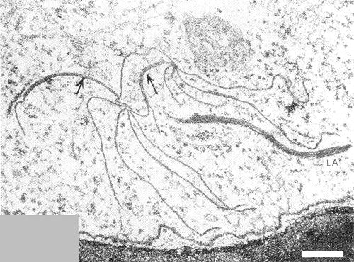 Virus particles were rarely seen in ultrathin sections of systemically infected coriander leaf cells, but the cells contained abundant pinwheel and bundle inclusions (Fig. 6) resembling those described for other potyviruses (Murant & Roberts, 1971).