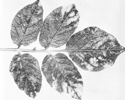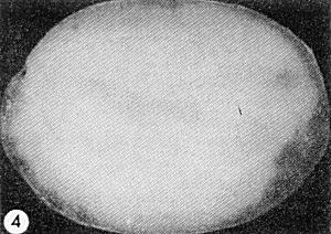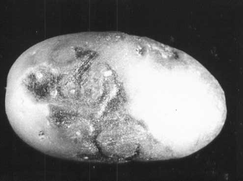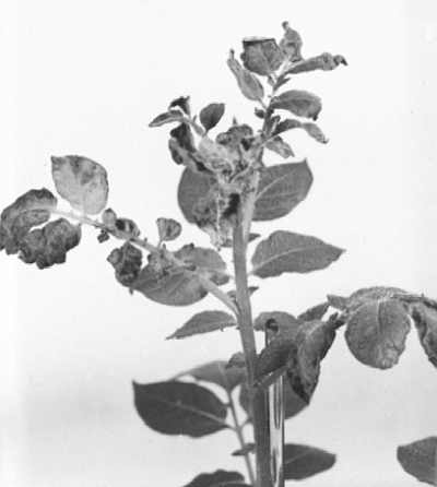 The type and intensity of the symptoms in potato plants depend on the strain of virus and the cultivar of potato. The two main types of symptom are: (1) bright yellow spots on the lower leaves, later coalescing to form large yellow or whitish patches (Fig. 1); (2) necrotic spots, often leading to systemic or top necrosis (Fig. 2) (Clinch, 1941). Some infected plants do not show foliage symptoms, especially during the second and subsequent years of infection and when growing under glass. During storage the tubers of many cultivars develop necrosis in the cortex and pith (Fig. 4) visible on the surface as irregularly shaped, brown patches or sunken dry brown areas (Fig. 3). Virulent virus strains may kill the tuber eyes.
