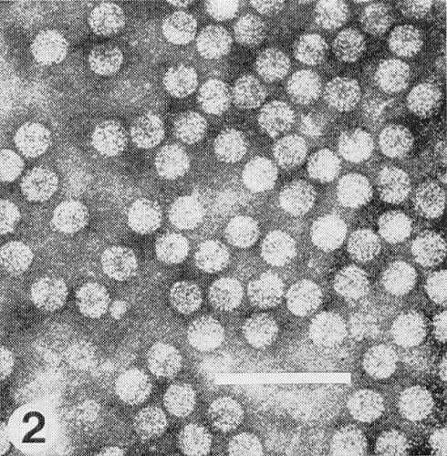 Particles are isometric, about 30 nm in diameter (Fig. 2) and are built of 180 subunits in pentamer-hexamer clusters; particle centre is hollow (Finch et al., 1967). The particles of most strains disintegrate when mounted in phosphotungstate for electron microscopy, unless previously fixed (for instance, 2% formaldehyde for 30 min). The particles are penetrated by phosphotungstate and contrast poorly.