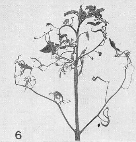 - Lycopersicon esculentum (tomato). Systemic mosaic and much narrowed leaf laminae (fern leaf, Fig. 6).