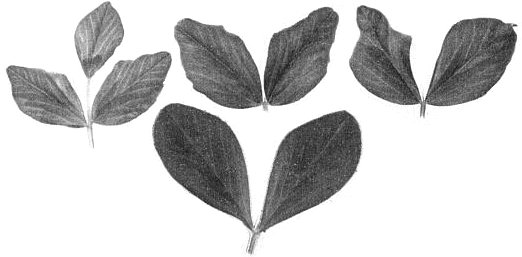 Vicia faba (broad bean). Systemic dark and light-green zonal leaf mottle, slight to moderate downward rolling of leaf margins. Distortions of leaf shape associated with mottle patterns (Hampton & Baggett, 1970) (Fig. 3).