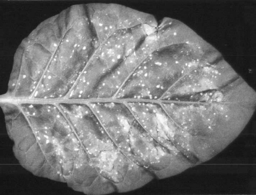 cv. Xanthi-nc. Older inoculated leaves show necrotic local lesions 2-4 mm in diameter after a few days; younger leaves produce more ring-like lesions (Paul et al., 1965; Fig. 2, Fig. 3). Both types of local lesion are smaller than those made by type strain and larger than those made by Corbetts (1967) isolate TMV-O. - The symptoms produced in orchid are not sufficiently reliable to be used as a diagnostic character.
