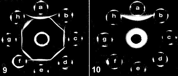 Reaction of antiserum to odontoglossum ringspot virus (central wells) with the following viruses: a = odontoglossum ringspot; b = opuntia ringspot; c = sunn-hemp mosaic; d = cucumber green mottle mosaic; e = tobacco mosaic, type strain U1; f = ribgrass mosaic; g = tobacco mosaic strain U2; h = tomato mosaic. (Fig. 9) Agar gel diffusion test; (Fig. 10) intragel absorption test (before the antiserum and the test antigens were applied, the antiserum well was supplied with a mixture of antigens b to h), the remaining homologous reaction shows the antiserum contains a large proportion of antibodies specific to odontoglossum ringspot virus.