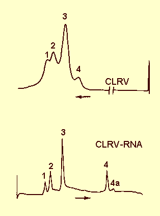 As shown in Fig. 4, purified preparations contain four nucleoprotein components (Garnsey, 1975). These are named according to increasing sedimentation velocities as: NP 4, NP 3, NP 2, and NP 1, respectively (Gonsalves & Garnsey, 1975b). Purified NP 3 and NP 4 are not infective alone or in combination (Gonsalves & Garnsey, 1974). Preparations of NP 1 +NP 2 are moderately infective and become highly infective with the addition of NP 3. The relative amount of the different components is similar, regardless of the host in which the virus was propagated.
