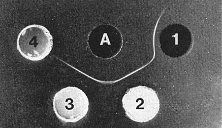 The virus is moderately immunogenic. Antisera with titres of 1/256 to 1/512 in gel diffusion tests have been obtained. Gels containing 0.75% agar and 0.04% sodium azide are preferable to gels with NaCl (8.5%) or phosphate buffer (0.05 M) added. A single precipitin band which curves to the antigen well (Fig. 6) forms in gel-diffusion tests with purified virus preparations containing all four components. Extracts from infected plants or purified virus mixed with sap from healthy plants contain a single, faster-moving antigen that forms a straight precipitin line when allowed to react in gel-diffusion plates with antisera prepared against the virus. No spur forms at the junction of precipitin lines formed to fast and slow antigens (Fig. 6). The virus can easily be detected serologically in extracts from young citrus leaves (Garnsey & Purcifull, 1969).