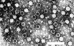 Particles are isometric c. 30 nm in diameter (Fig. 3) with icosahedral symmetry. Top component particles are penetrated by 2% phosphotungstate, pH 6.8.