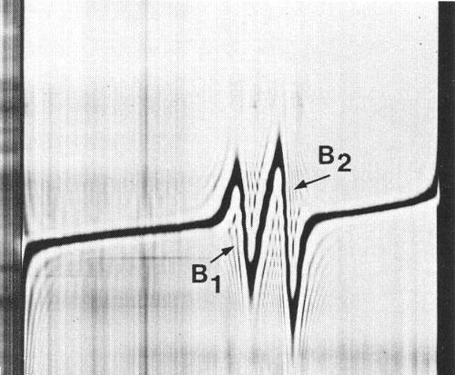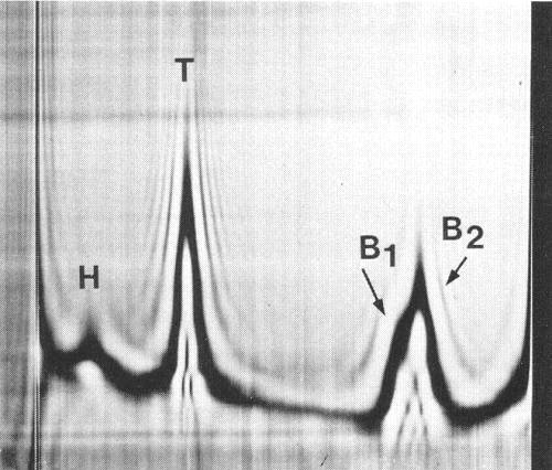 Schlieren diagram of a partially purified virus preparation after 17 min at 32 000 rev/min. T, B1 and B2 are virus-specific components whereas H is normal plant material. Component B is separating into the subcomponents B1 and B2. Sedimentation is from left to right.