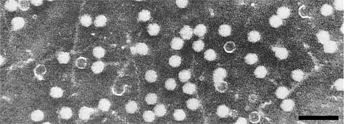 Particles are isometric, c. 30 nm in diameter, with angular outlines. T particles are penetrated by negative stain (Fig. 6).