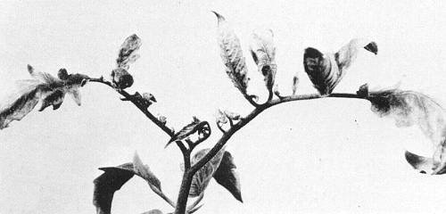 - Lycopersicon esculentum (tomato). Young opposite leaflets twist, tend to roll upward toward one another, and sometimes cross over the top of the petiole (Fig. 5, Fig. 7). Leaves become thickened, crisp, and yellowed with purplish veins. Plants take on a rigid, upright appearance (Fig. 6). All fruits turn red prematurely, and the plants decline and die.