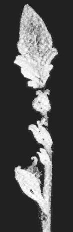 - Phaseolus vulgaris (French bean) cv. Bountiful. A sharp epinastic bend occurs at the base of the first trifoliolate leaf (Fig. 8) in plants inoculated in the cotyledon stage. Plants may die immediately or axillary buds may proliferate (Fig. 9) producing brittle, curled leaflets showing vein-clearing and vein-swelling, and crinkled upper surfaces.