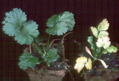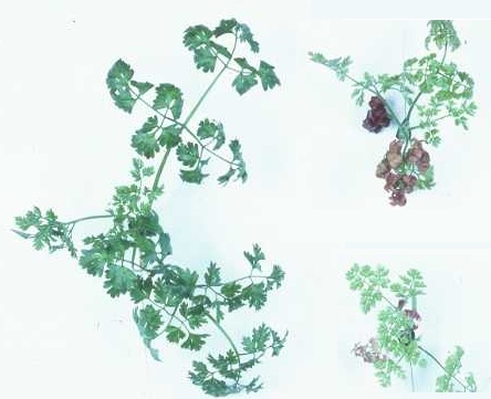 Chervil, Anthriscus cerefolium: (left) healthy, (upper right) infected with carrot red leaf virus, (lower right) infected with both carrot red leaf and carrot mottle viruses.