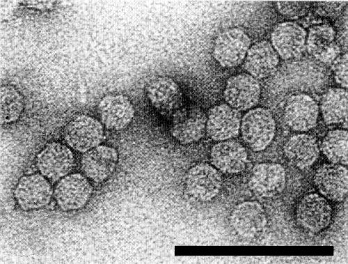 Particles of carrot red leaf virus. Prepared by the method of Horne & Ronchetti (1974) with 2% ammonium molybdate, pH 6.5, and 2% uranyl acetate. Bar represents 100 nm. (From Waterhouse & Murant, 1981a).