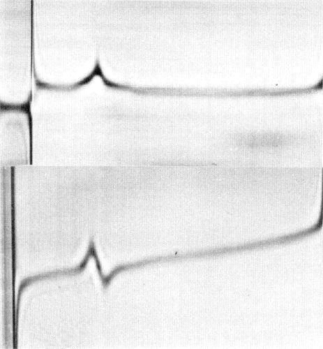 Schlieren patterns: (above) moving boundary sedimentation in 0.006 M phosphate buffer, pH 7.0, at 20°C. Photograph taken 8 min after a speed of 30,000 rev./min was reached; (below) equilibrium banding after centrifugation for 16 h at 20°C at 44,000 rev./min in a CsCl solution of initial density 1.44 g/cm3. (From Waterhouse & Murant, 1981a).