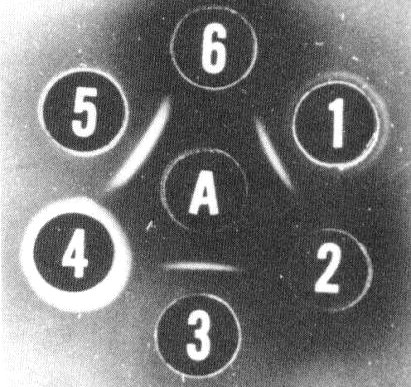 Detection of tobacco etch virus and inclusion antigens in sodium dodecyl sulphate (SDS) treated plant extracts by the immunodiffusion test. A = extract from tobacco etch virus-infected D. stramonium; 1 = antiserum to SDS-treated nuclear inclusions; 2 and 6 = extract from healthy Datura; 3 = antiserum to SDS-treated cytoplasmic (pinwheel) inclusion; 4 = normal serum; 5 = antiserum to SDS-treated virus.