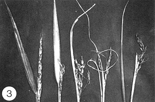 In rice the virus causes chlorotic stripes, chlorosis, moderate stunting and loss of vigour (Fig. 1); in severe infections the leaves develop brown to grey necrotic streaks and die. Diseased plants produce few or no panicles; those produced carry whitish to brown discoloured malformed spikelets (Fig. 3). Early infection of rice causes significant loss of yield (Yasuo, Ishii & Yamaguchi, 1965; Yasuo, 1969; Lee, 1969); late infection also reduces yield by retarding ear emergence and ripening (Yasuo et al., 1965). In maize and wheat the virus causes chlorotic stripes, chlorosis and stunting.