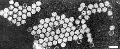 Particles are isometric, c. 28 nm in diameter and slightly hexagonal in outline. When unfractionated preparations are mounted in 2% neutral potassium phosphotungstate, many particles are unpenetrated, but others are penetrated either partially or completely by the electron-dense stain (Fig. 5).