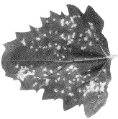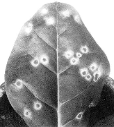 - Nicotiana tabacum (tobacco). Necrotic local spots or rings (Fig. 2); systemic necrotic or chlorotic ring and line patterns. Leaves produced later are symptomless but contain virus.