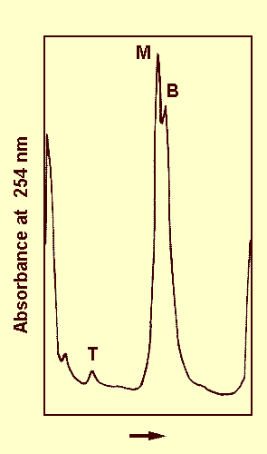 Linear-log sucrose density gradient profile of a purified preparation of a raspberry isolate showing relative concentration of top (T), middle (M) and bottom (B) components. Gradient was centrifuged in a Beckman SW 41 rotor at 4°C, 38 000 rev/mm for 90 min.