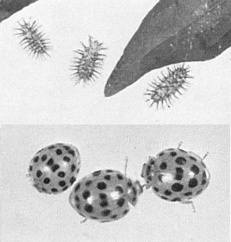 Following the terminology of Richards (1983), the established vectors (Greber, 1981) are Epilachna vigintioctopunctata pardalis (= E. sparsa) (Fig. 5), E. vigintisexpunctata vigintisexpunctata (= E. doryca australica) and E. guttatopustulata. All three vector species transmit the virus efficiently during the first feed after a 24 h acquisition access period, but with a 2 h acquisition period efficiency drops to c. 50% for single insects. Insects remain able to transmit for only 10 h if transferred to new plants at 2 h intervals, but for more than 24 h when fasting. Larvae are as efficient vectors as adults (Greber, 1981) but virus acquired by larvae is not transmitted when they become adults. A Psylliodes sp. (flea beetle) is an inefficient vector. The mirid vector of velvet tobacco mottle virus, Cyrtopeltis nicotianae, also transmits solanum nodiflorum mottle virus (J. Randles, unpublished data), but does not seem to be an important natural vector (Greber, 1981).