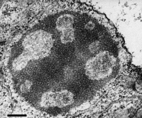 Inclusion body in the cytoplasm of a soybean leaf cell seen with the electron microscope. Note the vacuolated, electron-dense matrix with embedded virus particles. Bar represents 200 nm.
