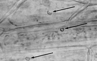 Inclusion bodies (arrows) in epidermal cells of bean seen with the light microscope. The tissue was stained with l% phloxine for a few minutes and then repeatedly rinsed in saline.