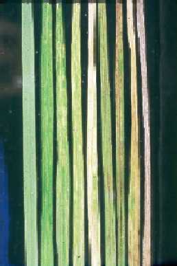 Leaves of S22 Italian ryegrass infected with a virulent isolate of ryegrass mosaic virus from England. The leaf on the left is healthy.