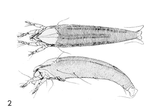 The mite vector, Abacarus hystrix, dorsal and lateral views. The adult mites are about 250 µm long (Keifer, 1952).