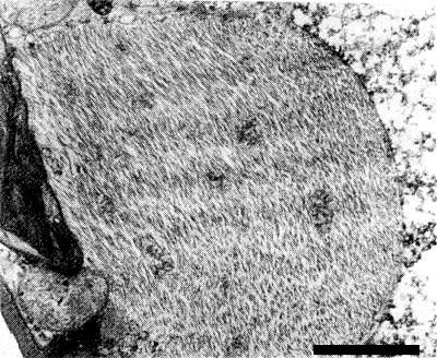 Virus inclusions (Fig. 5) occur in the cytoplasm of all leaf tissues of infected cassava plants, except tracheids and sieve tubes. They consist of fibrous masses containing filamentous particles of indeterminate length and 10-15 nm in diameter, running more or less parallel, but not in a definite arrangement. Virus inclusions are variable in size, generally elongated, up to 15-20 µm long and 3-5 µm wide as seen in sections. They are more frequent in yellow leaf areas. No major changes in cell components were associated with virus infection, except for abnormal accumulation of starch in the chloroplasts (Kitajima & Costa, 1966).